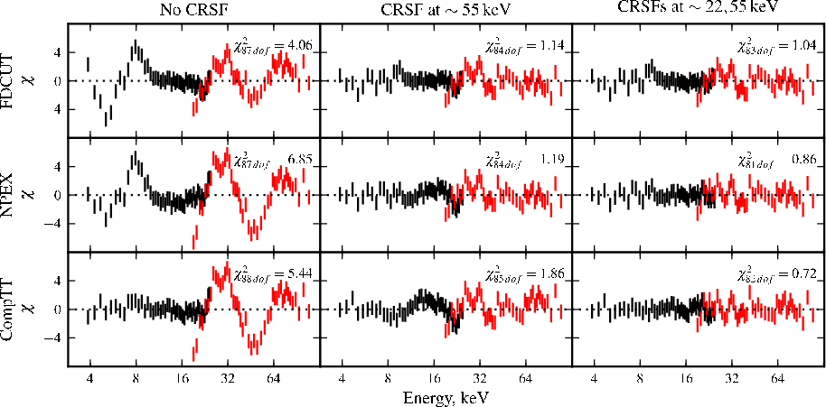 the FDCUT, NPEX, and CompTT models (Mihara 1995; Titarchuk & Lyubarskij 1995; Coburn et al. 2002) with qualitatively similar goodness of the fit, modified by photoelectric absorption and iron emission line at