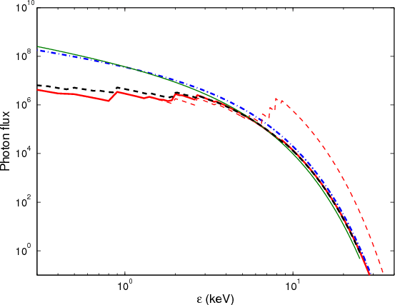 The revised thermal model spectra (dot-dash blue is TB; thick