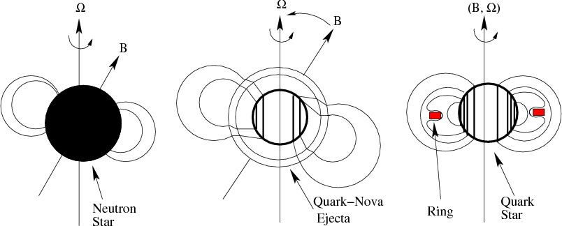Figure 1: Illustrated here are the stages involved in the transition from a neutron star (NS) (inclined rotator) to a quark star (QS) (aligned rotator) in the Quark-Nova scenario. The collapse of the quark core induces an explosive NS-to-QS transition ejecting iron-rich degenerate crust material. The QS enters a superconductive phase confining the interior field to vortices, forcing the exterior field to align with the rotation axis (see Ouyed et al. 2004, for more details; and Ouyed et al. 2006, for the related simulations). The iron-rich degenerate ejecta evolves into a Keplerian ring (at about 15-30 km from the star) surrounded, but not penetrated, by the dipole field (a co-rotating ejecta is also possible depending on the NS period; see OLNI). |