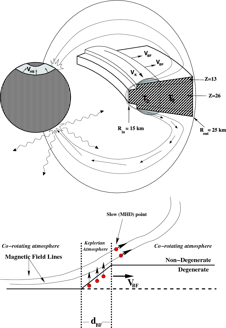 - We recall that in the degenerate Keplerian disk, lower viscosity and conservation of angular momentum imply mass flows in the ring is along lines of constant angular momentum which is nearly vertical (i.e. z-direction; see Appendix A in OLNII). Thus as the non-degenerate Keplerian material is ``sucked up'' in the wind, more material is supplied almost vertically from the underlying Keplerian material.