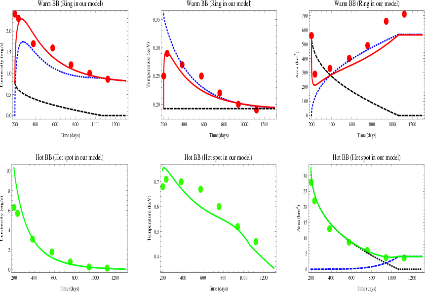 of temperature, luminosity, and area of the two X-ray blackbodies with time.