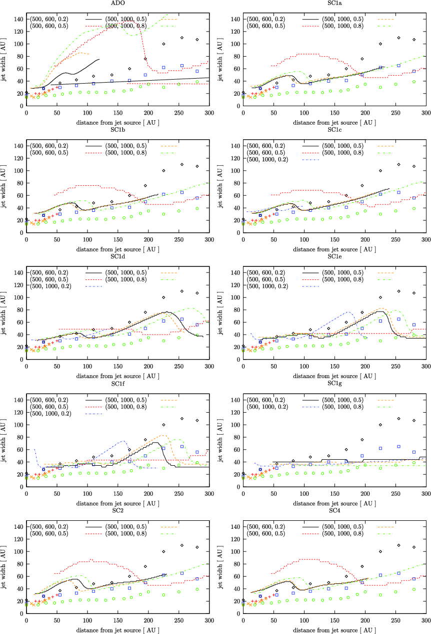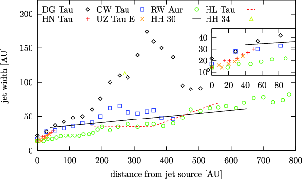 In order to test our truncated models, we will now apply our simulations to observations. In recent years, many NIR and optical data have become available exploring the morphology and kinematics of the jet launching region (e.g. Ray et al. 2007; Dougados et al. 2000; Dougados 2008, and references therein). Hubble Space Telescope (HST) and adaptive optics (AO) observations give access to the innermost regions of the wind, where the acceleration and collimation occurs (Dougados et al. 2000; Woitas et al. 2002; Ray et al. 1996; Hartigan et al. 2004). Because YSO jets emit in a number of atomic (and molecular) lines, we used a set of tools described in Gracia et al. (in prep.) to create emission maps in different forbidden lines which were used by other authors to extract the jet width from images. The observed jet widths will be compared with those extracted from our synthetic images. A similar study has been done by Cabrit et al. (1999), Garcia et al. (2001) and Dougados et al. (2004) using a different set of semi-analytical self-similar disk-jet solutions from Ferreira (1997) and Casse & Ferreira (2000a). Observed jet widths could be reproduced by manually truncating the solutions inside 0.07 AU and outside 1 AU, but the modification of flow streamlines induced by truncation was ignored.