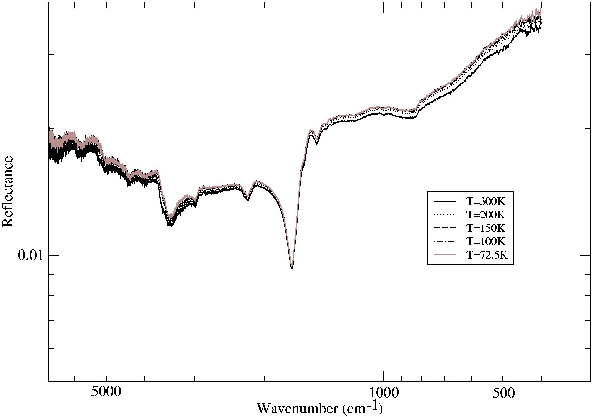 Bidirectional reflectance spectra of a tholin pellet sample at temperatures of 300, 200, 150, 100 and 72.5 K are reported in Fig. 2. It is evident from the figure how the reflectance increases at lower temperatures with an overall variation of about 5% in the whole range 300-72.5 K. At 72.5 K the features at about 3400 cm-1 become narrower and those at 2950 and 5030 cm-1 increase in intensity by about 3%. The absorption features become slightly intense and sharpen with decreasing temperature.