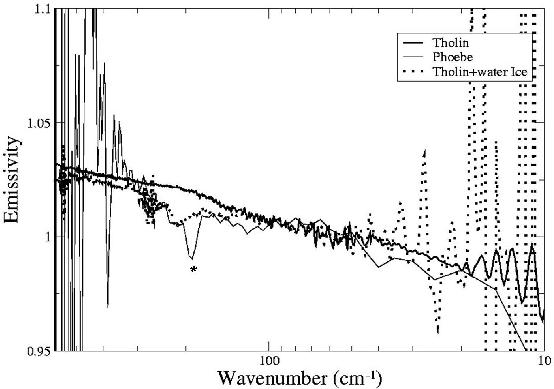 As explained previously, the spectra of tholin and water ice obtained experimentally are a linear combination of the tholin reflectance and water ice absorption. In Phoebe's spectrum shown in Fig. 4 the band profile at 220 cm-1 resembles that of pure absorbance instead of emittance of water ice. Thus a pure inversion of the spectrum in Fig. 3 through Kirchhoff's law would produce a peak at 220 cm-1 instead of a valley and the observed Phoebe's spectrum would not be reproduced. Optically this is could be related to the value of the complex refractive index of water ice (Hudgins et al. 1993). Using the Fresnel formulas we can calculate the reflection and transmission of light from a slab, thus it is possible to evaluate that transmission at 220 cm-1 from water ice is two orders of magnitude larger than reflection on the ice surface. Thus the absorption feature at 220 cm-1 could be attributed to water ice both embedded at the molecular level in a matrix of tholin grains settled on a smooth compact tholin surface or to water ice that covers the satellite surface as a thin layer. In Fig. 4 we compared the Phoebe spectrum with that obtained in laboratory. Specifically, the water ice spectrum in absorption was linearly added to the emission of flat tholin and the resulting spectrum scaled manually to match the 220 cm-1 band on Phoebe. As is clear from Fig. 4 the Phoebe spectrum is well reproduced by the laboratory one. This result is telling us that the infrared radiation emitted by Phoebe from a surface made by smooth tholin is absorbed by water ice present or in the small transparent grains or as a coating layer. The band observed at 190 cm-1 and marked in Fig. 4 with an asterisk is due to a spurious electronic spike (Carvano et al. 2007). Changes induced in laboratory spectra by temperature variations were observed to be negligible when compared to the uncertainties of CIRS data.