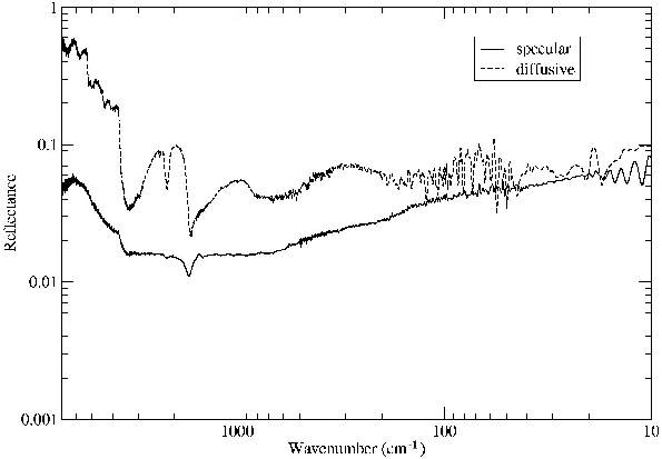 The reduced band contrast that is observed in specular reflectance spectrum at wavenumbers larger than 1000 cm-1 is mainly due to the absence of multiple scattering of light that usually occurs within the powder. The single reflection of IR radiation on the flat surface is responsible for reduced absorption feature intensities of 1685 (-NH bending), 2170 (-NCO stretching), 2950 (-CH stretching), and 3400 cm-1 (-OH and/or NH stretching) functional groups and the difference in intensity between diffuse and specular reflectance decreases at lower wavenumbers until it becomes negligible for wavenumbers lower than 150 cm-1.