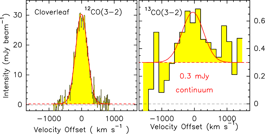 Molecular lines from galaxies in the distant universe have the potential to reveal the contribution of early stellar generations to the enrichment of the interstellar medium. Our data from the z = 2.5 Cloverleaf QSO are a first step toward studying the isotopic composition of such gas in the distant past. Our data indicate, not unexpectedly, a strong deficiency of 13C with respect to 12C in the host galaxy. However, the weakness of the tentatively detected line, the limited number of observed transitions, the poorly constrained source morphology, and the potential influence of an enhanced submillimeter radiation background do not yet allow us to derive a definite 12C/13C isotope ratio. Significant progress in this field either requires the detection of stronger sources or the higher instrumental sensitivity of the Atacama Large Millimeter Array (ALMA), which will allow us to study the isotopes of C, N, and O in a number of highly redshifted targets. Toward the Cloverleaf, the main isotopologes of HCN, HCO+, and CN (Solomon et al. 2003; Riechers et al. 2006a, 2007) have already been detected. AcknowledgementsWe wish to thank P. P. Papadopoulos, D. Riquelme, S. Veilleux, and an anonymous referee for helpful discussions on ULIRGs and chemical evolution and/or a critical reading of the manuscript. This paper is based on observations taken with the IRAM Plateau de Bure Interferometer. IRAM is supported by INSU/CNRS (France), the MPG (Germany), and the IGN (Spain). D.R. acknowledges support from NASA through Hubble Fellowship grant HST-HF-01212.01-A, awarded by the Space Telescope Science Institute, which is operated by AURA for NASA under contract NAS5-26555. This research has made use of NASA's Astrophysical Data System (ADS).