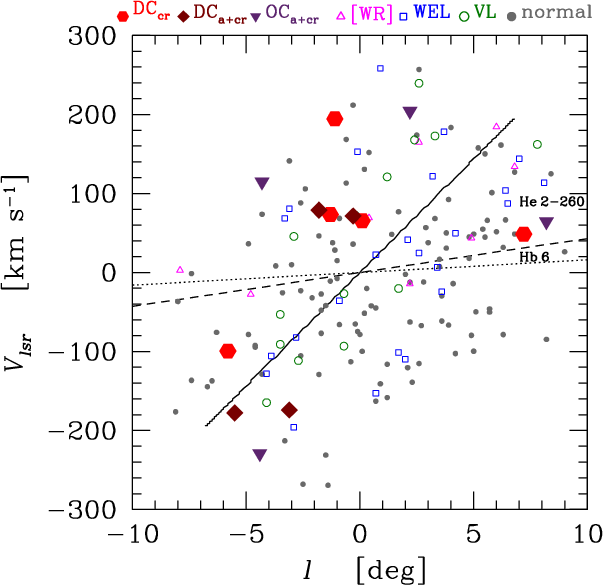 5 from the center whereas bulge [WR] PNe are often found at greater longitudes. Obviously, the 4