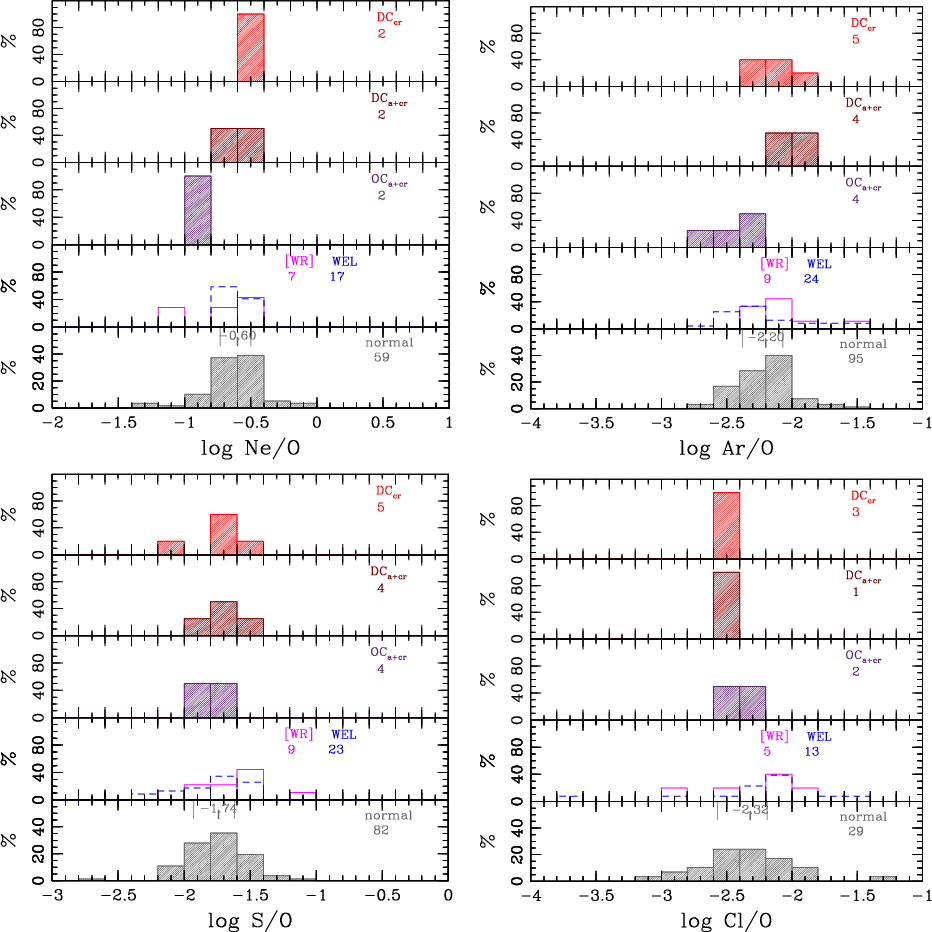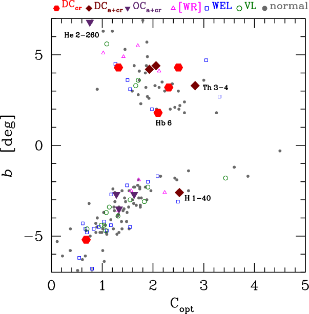 - In the Galactic bulge, only [WR] PNe with CSs of intermediate [WC] spectral classes are known, in contrast to the situation in the Galactic disk (see e.g., Górny et al. 2001).