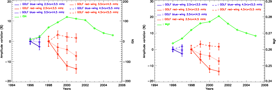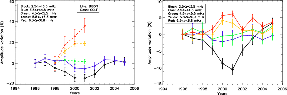 This work has been supported by the Swiss National Funding 200020-120114, by the Spanish grant PENAyA2007-62650 and the CNES/GOLF grant at the SAp-CEA/Saclay. SOHO is an international cooperation between ESA and NASA. This paper also utilizes data collected by the ground-based BiSON network. We thank the members of the BiSON team, both past and present, for their technical and analysis support.