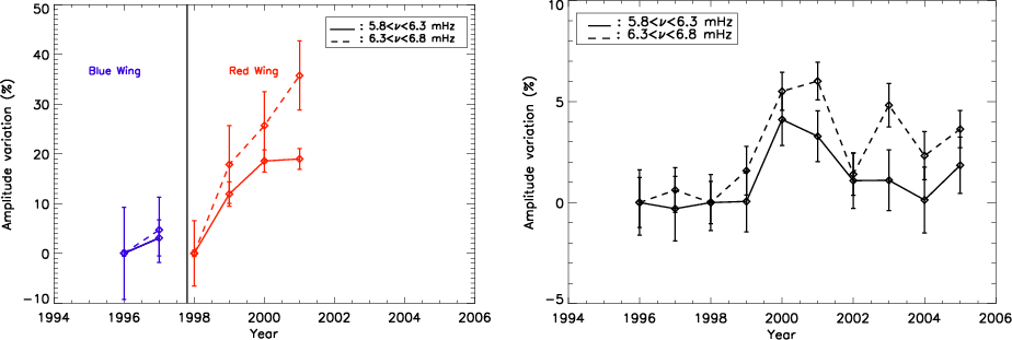 5.5 mHz the findings hint within the errors to a null change both in the velocity and intensity amplitudes. At still higher