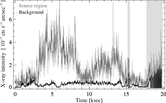 Figure 1: EPIC/pn X-ray intensity in both the source region (source plus background) and the source-free background region during the 20 ks XMM-Newton observation, binned into time intervals of 10 s. |