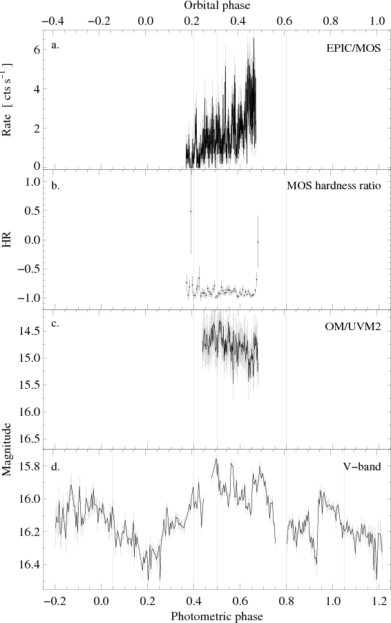With XMM-Newton, we obtained a 20 ks (5.6 h) exposure during a high state of AI Tri on August 22, 2005 (observation ID 0306841001), which covers for the first time uninterruptedly more than one complete binary orbit. The EPIC instruments were operated in full frame mode with the thin filter. The UV light curve at an effective wavelength of 2310 Å was measured simultaneously using the optical monitor (OM) in fast mode with the UVM2 filter. RGS spectra were not used from this pointing, since the X-ray flux of the object was too low, and the net source count rate measured by the RGS instruments was consistent with zero for more than 80% of the exposure time.