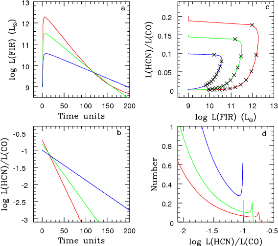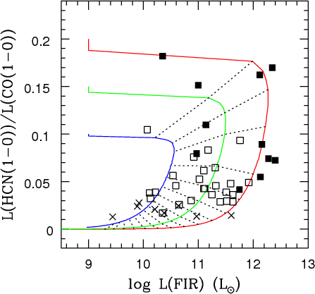 The observed nearly linear relations between the emission luminosity of high-density tracers and the far-infrared luminosity (FIR) represent the response of the nuclear medium to the activity in the evolving nucleus (Gao & Solomon 2004; Baan et al. 2008; Curran et al. 2000). The star-formation that generates the FIR luminosity also proportionally depletes and destroys the high-density (HD) component of the nuclear ISM, and the HD line emission decreases in time. The low-density (LD) component, however, is not involved in the star-formation process and will remain (largely) the same. For this reason, the changing HD/LD ratio during a nuclear outburst may serve as an indicator of the evolutionary age of the outburst. In Sect. 2.3, it will be proposed to use the HCN (1-0)/CO (1-0) line emission ratio as an indicator of the HD/LD emission ratio and the evolutionary stage of the starburst.