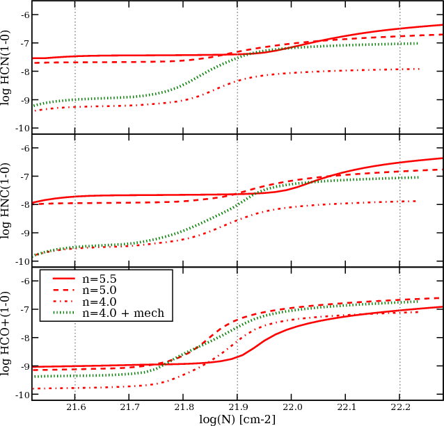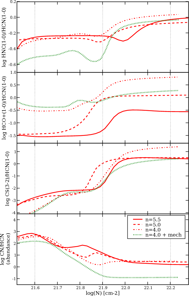The abundance simulations of PDR-dominated emission regions show that the CN/HCN abundance ratio in regions with high column densities remains close to unity when lowering the density from 105.5 to 104 (Fig. 2). Radiation transfer calculations have not yet been done for CN. This absence of variation of the CN abundance is consistent with the CN (2-1)/HCN (1-0) data points in Fig. 8b (red arrow). The introduction of mechanical heating due to feedback at later evolutionary times (green arrow) would lower the relative abundance by as much as a factor of 20, which is not yet seen in the data.
