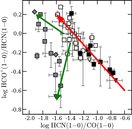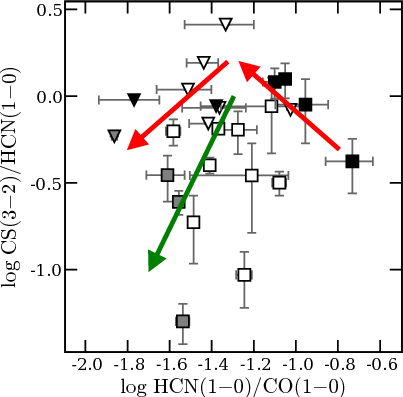 Figure 9: The ratios of CS (3-2)/HCN (1-0) versus the HCN (1-0)/CO (1-0) ratio. The symbols and colors are as in Fig. 6. |