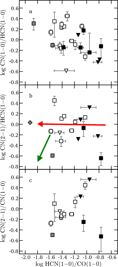 The variation of the two CN/HCN ratios versus the HCN/CO ratio are presented in Fig. 8. The CN (1-0)/HCN (1-0) ratio (Fig. 8a) displays a distribution that increases with decreasing HCN/CO ratios. On the other hand, the CN (2-1)/HCN (1-0) distribution (frame b) shows twice the spread of the CN (1-0)/HCN (1-0) ratio with a consistently zero slope.