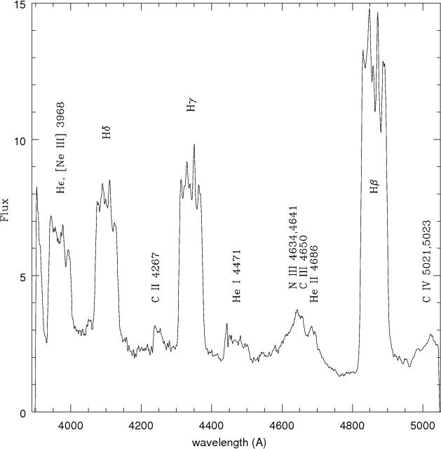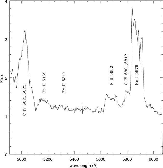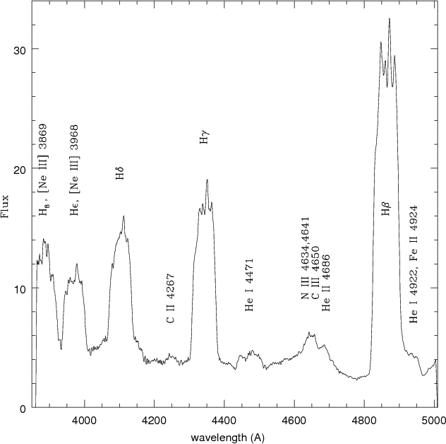 The second intense emission line in Fig. 3 is seen at 5027 Å. The blend of He I 5016 and Fe II 5018 is prominent around this wavelength in the spectra of usual classical novae in the early decline stage. Thus Williams et al. (1994) identified this emission as He I 5016. However, if this had been the case, the other emission line of He I 4922 should have been detected with nearly the same intensity, but such an emission was not seen in our spectrum (Fig. 2). In addition to this, the profile of the emission at 5027 Å was different from those of the other He I lines, but resembled that of the highly ionized emission line He II 4686 (Fig. 2). Because the emission lines of carbon ions were unusually intense in these spectra, we identified the emission at 5027 Å as C IV 3, 5021 and 5023 (Moore 1959). Probably there were also He I 5016, Fe II 42, 5018, and C II 35, 5047.2 as minor components in the emission.