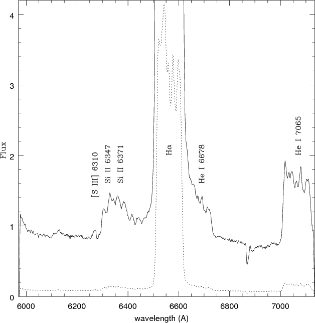 identified as a blend of Si II 2, 6347, 6371, and [S III] 3F, 6310.