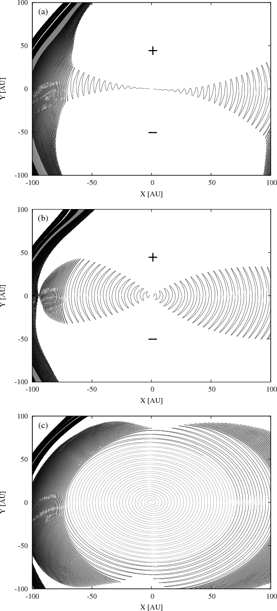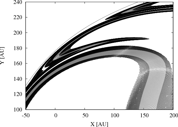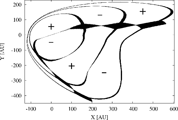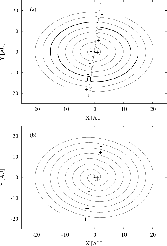 Similarly to the method of Nerney, Suess and Schmahl, our method is not self-consistent, since the effect of the HCS on the plasma flow is not taken into account. Self consistent solutions require numerical simulations. However, including the HCS in the numerical simulations is very difficult and presently available solutions are not adequate for some applications (see discussion in Sect. 4.2). If our basic assumption that the HCS is approximately a passively convected discontinuity is acceptable, our approach is useful for study of the HCS structures which up to now could not be described by numerical models.