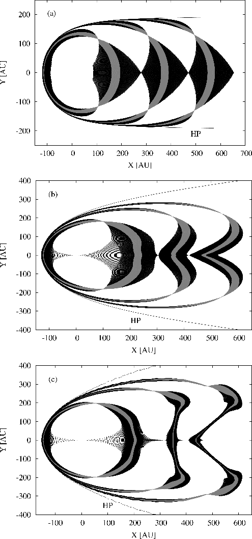 The published models are much more simplified (Linde et al. 1998; Washimi & Tanaka 2001; Opher et al. 2003,2006; Pogorelov 2006; Pogorelov et al. 2004,2006,2009). In particular, the effect of the magnetic field reversals on the HCS is not included. Pogorelov et al. (2009) consider the field reversals but the HCS is not resolved.