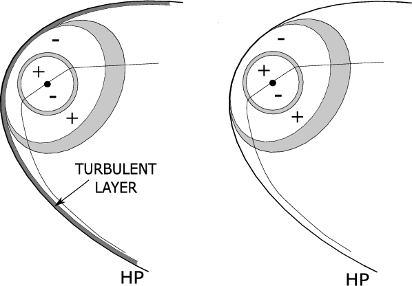 Figure 15: Schematic view of two scenarios for the magnetic field structure in the forward heliosheath. In the figure on the left the layers of tightly folded HCS alternating with unipolar regions become replaced near the heliopause by a turbulent region of disordered magnetic field. In the figure on the right a unipolar region reaches the heliopause in result of destroying the previous magnetic field structure by reconnection. The grey rings represent the mixed polarity regions and the thin line the bent solar equatorial surface. HP marks the heliopause. |