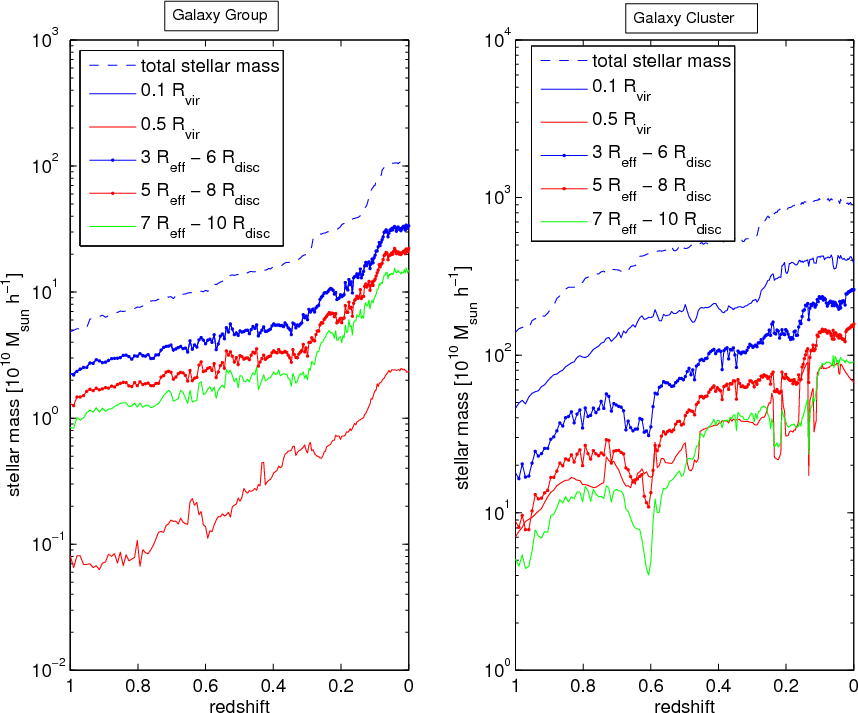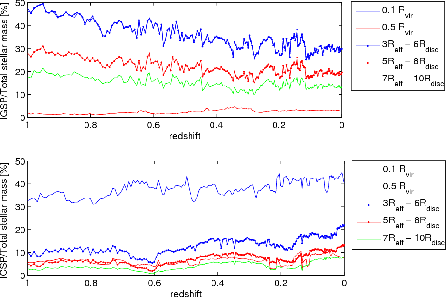 - After each enhanced merger activity due to mass accretion of the systems an increase in the stellar mass present in the ICSP/IGSP can be found, which then decreases due to violent relaxation.