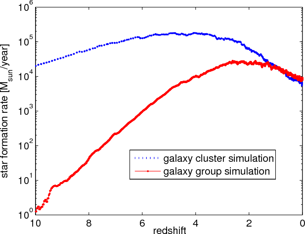 - We found a major difference between the gradient in the evolution of the fraction of the ICSP and IGSP to the total stellar component. The fraction of ICSP in the galaxy cluster simulation increases little with decreasing redshift, whereas the fraction of stellar mass in the IGSP decreases with decreasing redshifts, although the virial mass in both systems increases in the same redshift interval. The dense, dynamical environment in galaxy cluster produces many high-velocity galaxy encounters which refill the ICSP perpetually. In the galaxy group system encounters are not as frequent and do not have as high relative velocities as in the galaxy cluster system, leading to a decrease in the fraction of IGSP to the total stellar population in the galaxy group system by violent relaxation.