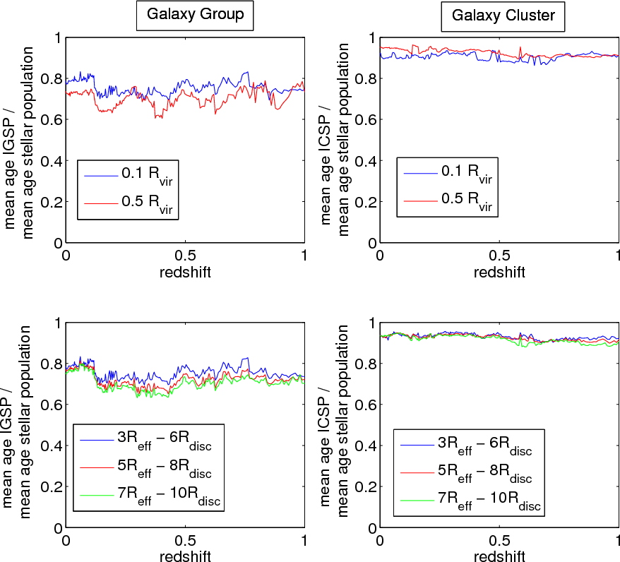 - The mean age of the stellar component present in the ICSP/IGSP is younger than the mean age of the stellar component present in the galaxies. For galaxy clusters the ICSP is on average 10% younger and the IGSP is on average 20% younger. Due to the high interaction rate with high relative velocities present in galaxy clusters stellar particles in the intergalactic regions do not violently relax at the same rate as in the galaxy group system.