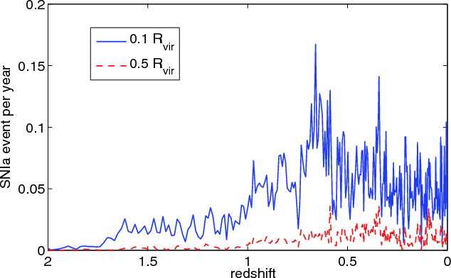 15: Number of SN Ia events as a function of redshift in the intra-cluster stellar population for separation criterion 1 and criterion 2. |