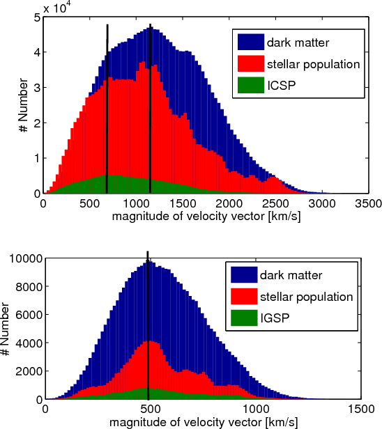 18: Velocity distribution of the magnitude of the dark matter, stellar and ICSP/IGSP particles (separation criterion 4) in the galaxy cluster and group simulations in a 3 Mpc sphere around the cluster centre. The black vertical lines highlight the maximum in the dark matter and ICSP/IGSP components. |