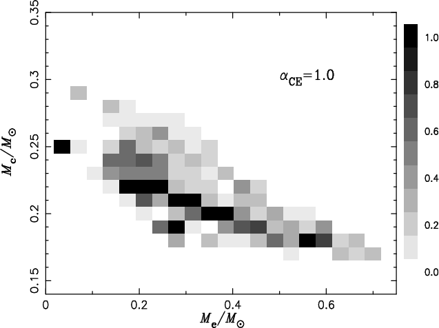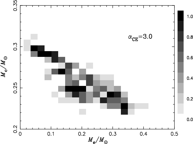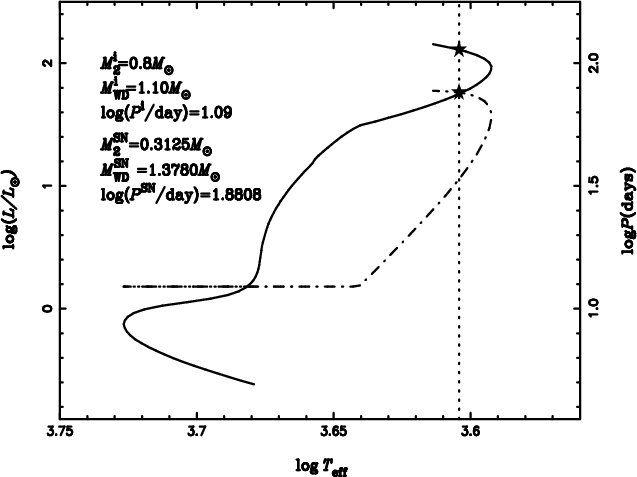 - In the figures, we do not show the cases of WD + MS because: (i) the definition of the core for a MS star is incorrect; (ii) the interaction between supernova ejecta and the companion is complex, i.e., the stripped-off mass from the companion strongly depends on both the evolutionary stage of the MS star at the onset of RLOF and the initial parameters of a WD + MS system (Meng et al. 2007); and (iii) the study of WD + MS is beyond the scope of this paper.