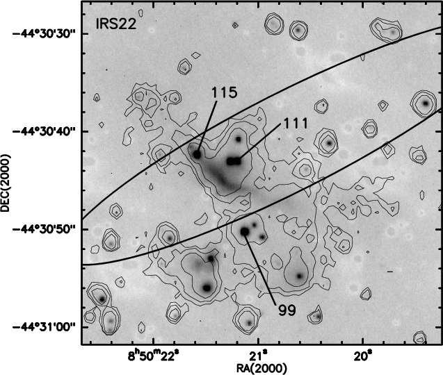 IRS16 is different from the other 5 IRAS sources in the present sample, in that it was not considered as a ``bona fide'' Class I source by Liseau et al. (1992). It is indeed the only one associated with an H II region, i.e., 263.619-0.533 (Caswell & Haynes 1987). Massi et al. (2003) show that the IRAS uncertainty ellipse is roughly centred on a B0-B2 star (their # 90, see also Fig. 1). Massi et al. (2007) found that the IRAS uncertainty ellipse lies towards a minimum in 1.2-mm continuum emission, in the middle of three prominent peaks (their MMS1, MMS2, and MMS3). It is possible that the FIR emission originated in an UCH II region close to the central B star. The source exhibiting the steepest rising SED in Fig. A.1, is # 123 of Massi et al. (2003), but it lies outside the uncertainty ellipse. Another NIR source with a rising SED is # 100 of Massi et al. (2003), which lies within the IRAS ellipse (see Fig. 1). Both were already identified in JHK by Massi et al. (2003).