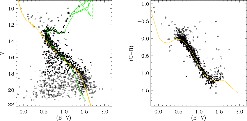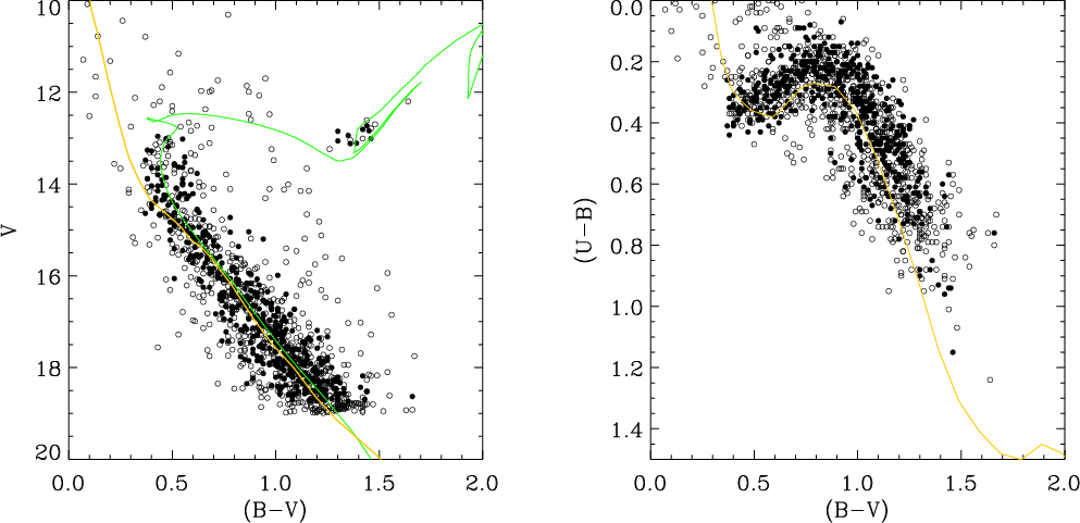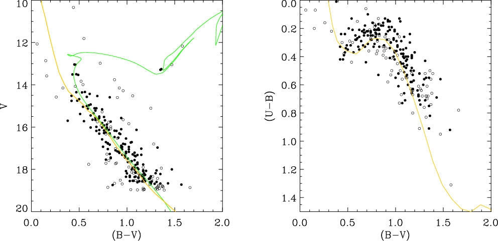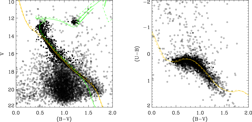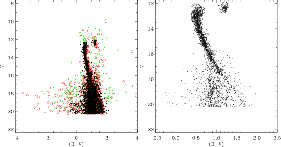 As we can see in Fig. 21 for the data from Yadav & Sagar (2002) (Ref. 320), our filtering technique has removed some bright stars that may belong to the turn-off of the cluster. The removal happened because in all cases these were single events in that region of the CMD and thus no statistic could be performed. We have introduced an option to keep these single points if the case may present itself but did not use it in this cluster as it introduced considerable contamination along with the wanted stars in the tip of the turn-off. It may be the case that in these situations our errors are underestimated since these stars have low photometric errors when compared to the fainter and more numerous stars.