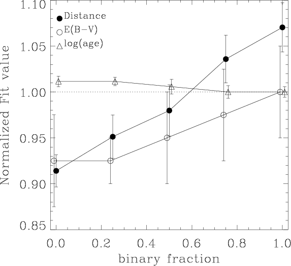 The large spread in the main sequence region is also an important factor as pointed out by Aparicio et al. (1993), where they argue that the large spread may be an indication of a large number binaries and based on this they estimate a value of 22% for the binary fraction. It is clear from Fig. 8 that our method of including binaries does a good job in accounting for their presence as can be seen also by the agreement in the distance determined by the fit.