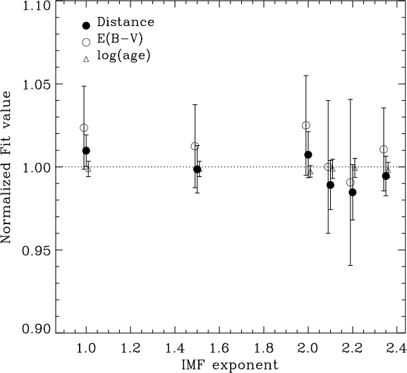 Another aspect that plays a major role in the final results is the binary fraction. This is a characteristic of the clusters that is not easily accounted for even in visual fits and so it is difficult to evaluate how much this is relevant in each individual case. We have accounted for this effect by assuming a 100% binary fraction and drawing companions from the same IMF used to generate the fitting points. While this is clearly not the correct binary fraction for all clusters, the effect of adopting that value is relatively small, as shown in Fig. 5, due to the fact that effectively only binary systems with similar mass will show a significant difference in magnitude on the CMD.