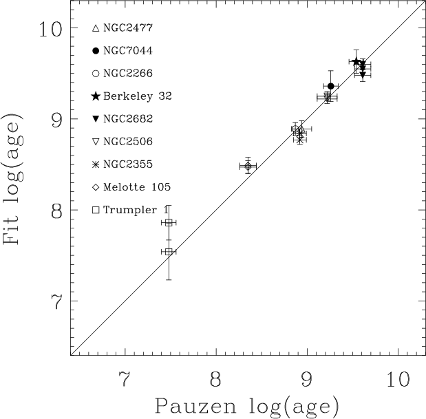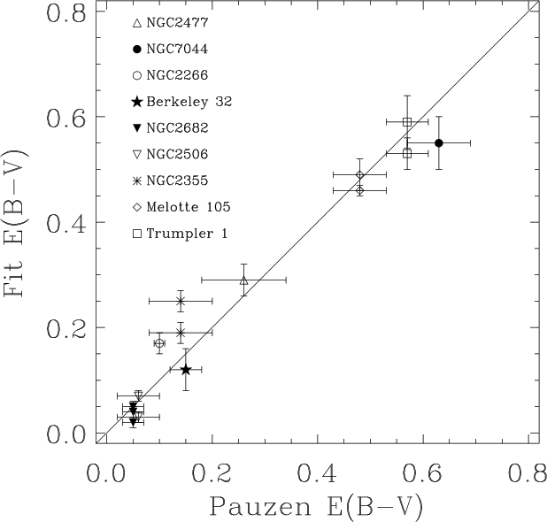 The final results show that there is good agreement in general with the results adopted as standards in the literature, but also indicates that some issues still remain unresolved. Perhaps the most important of these issues is related to the metallicity. As mentioned before, we kept the metallicity values fixed in our fits and attempted to use the ones provided by the observers, except in cases where we believed more reliable values were available. Many of the clusters show results that could be clearly improved by changing the metallicity, as for example the case of NGC 7044. Given the considerations above, it is also important to point out that the values we used for comparison taken from the proposed standard list of Paunzen & Netopil (2006) do not take metallicities into account. The different author determinations for the parameters that were averaged possibly were derived using different metallicities.