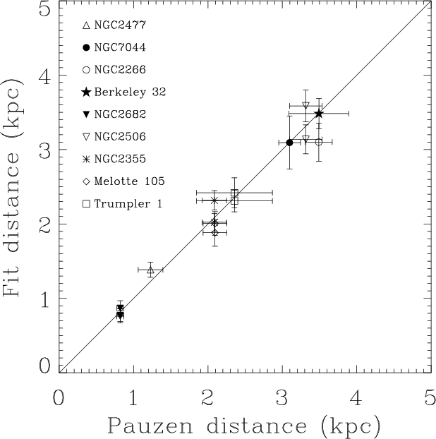 For the open cluster Trumpler 1 the fitted distance agrees within the