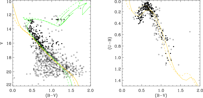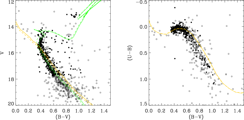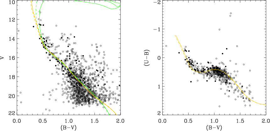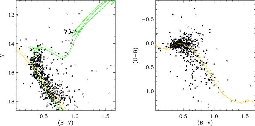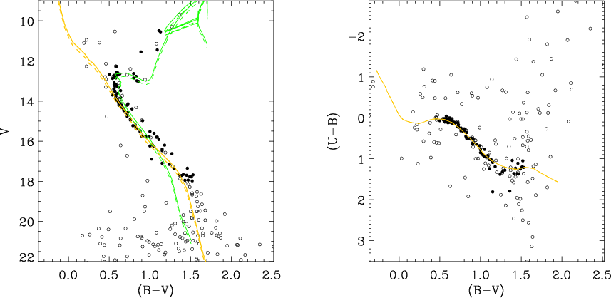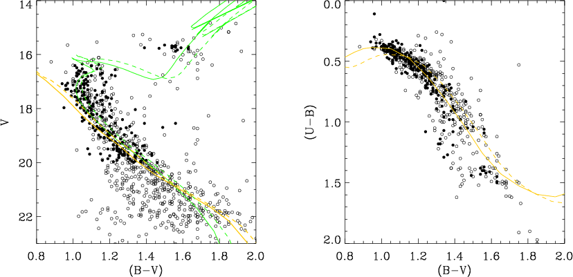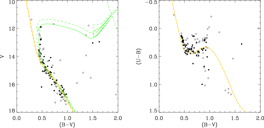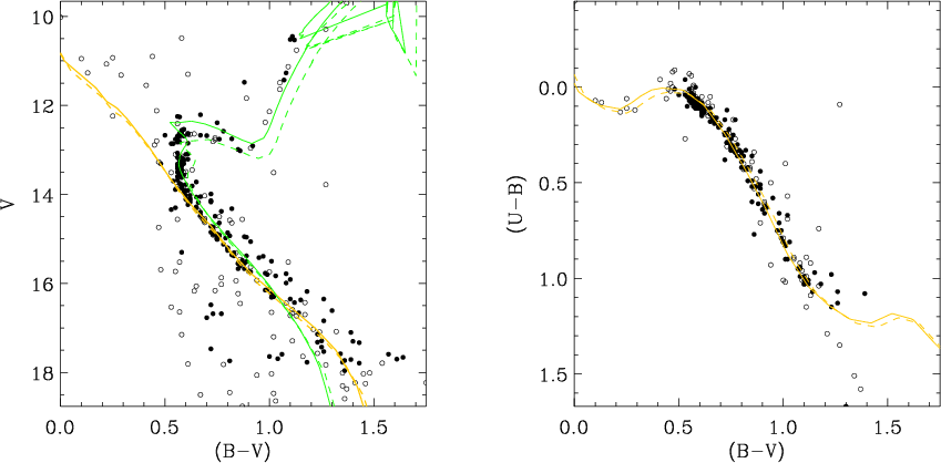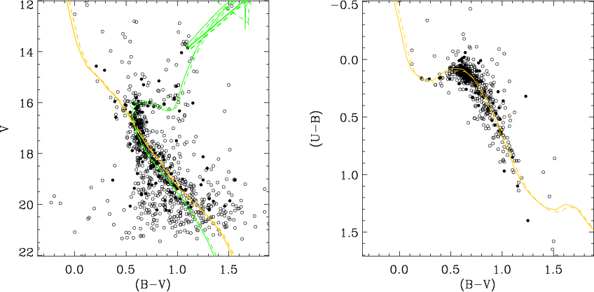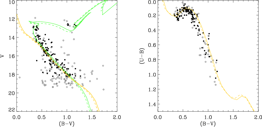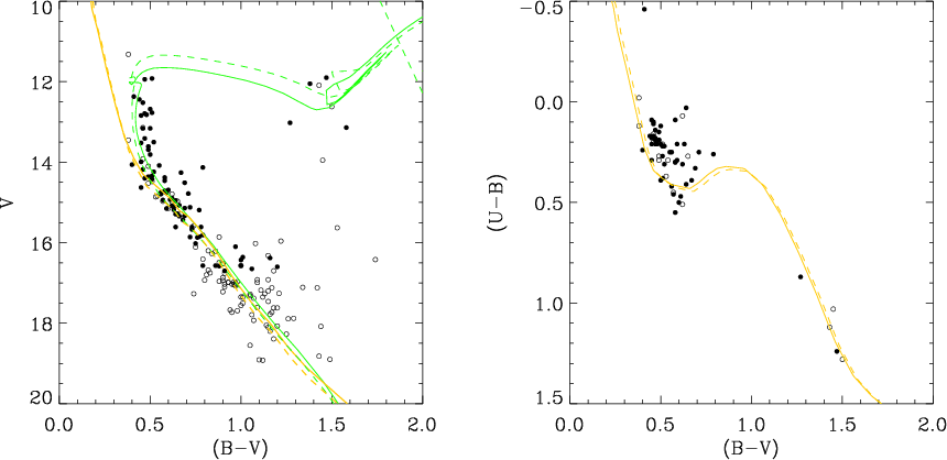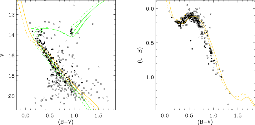 The situation is similar when we examine the results presented in Fig. 21 for the fit of the observational data provided by Phelps & Janes (1994) (Ref. 86). In this case our filtering technique also rejected single points in the CMD in the region of the turn-off. The same considerations made above about the errors apply in this case.