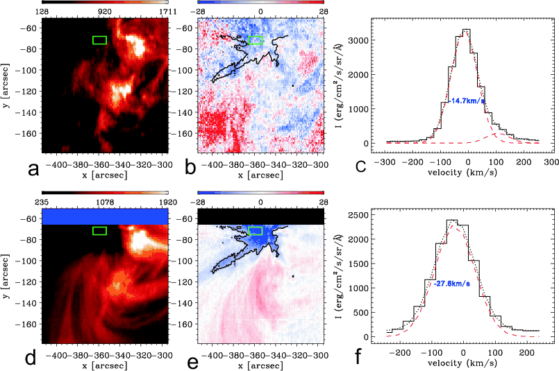 Maps of the Doppler-shift of various emission lines were obtained from the rasters of EIS, which scanned across an area from west to east between 01:12:16 and 02:08:57 UT. The spectral center of the line profile was at every spatial pixel derived by using the centroid method (Dammasch et al. 1999). Artificial effects of slit tilt and the orbital variation in the spatial distribution of the spectral center were removed before deriving the Doppler-shift distribution. The orbital variation is represented by a quasi-periodic variation in the line centroid position, which is caused by the thermal drift in EIS instrument during an orbit. The orbital variation in the Fe XII line is used to correct that of the He II line. We assume the mean spectral center, inferred by averaging over the whole map of the spectral center (for each pixel) of an emission line, to be the rest wavelength of that emission line. Finally, calibrated Doppler-shift maps of the emission lines were thus obtained. The EIS images of intensity and Doppler-shift were co-aligned with the TRACE-images. For simplicity, we did not rotate the slit-positions as recorded by EIS at different times to the same reference time.