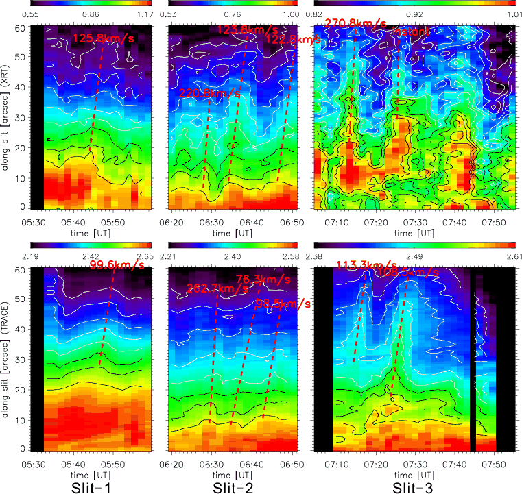 (75-150 km s-1) close to the coronal sound speed, were supposed to be