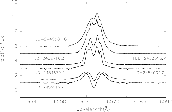 emission wings and shell absorption core obtained via averaging the independent measurements by J. Nemravová and P. Harmanec; DAO = Dominion Astrophysical Observatory, Victoria; ROZ = Rozhen National Observatory; OND = Ondrejov Observatory; LIS = IGeoE-Lisbon; OHP = Haute Provence Observatory.
