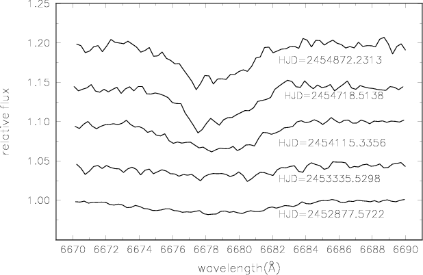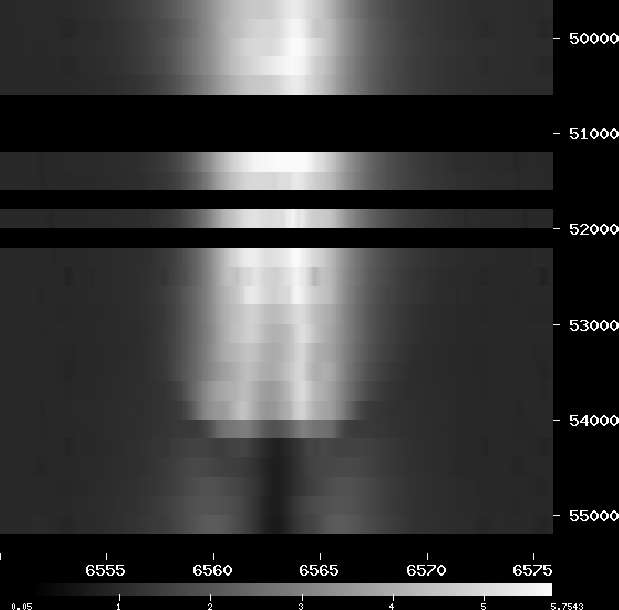 CCD for data after May 2005. They cover a wavelength region from 6150 to 6750 Å, have a linear dispersion of 10 Å mm-1 and 2-pixel resolution of 21700 (
