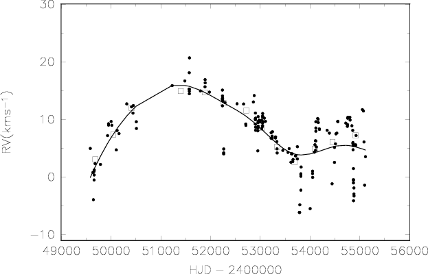 a smooth RV curve with a period of about 13 000 days (35.6 years),