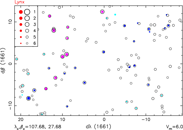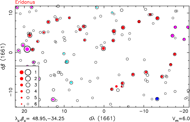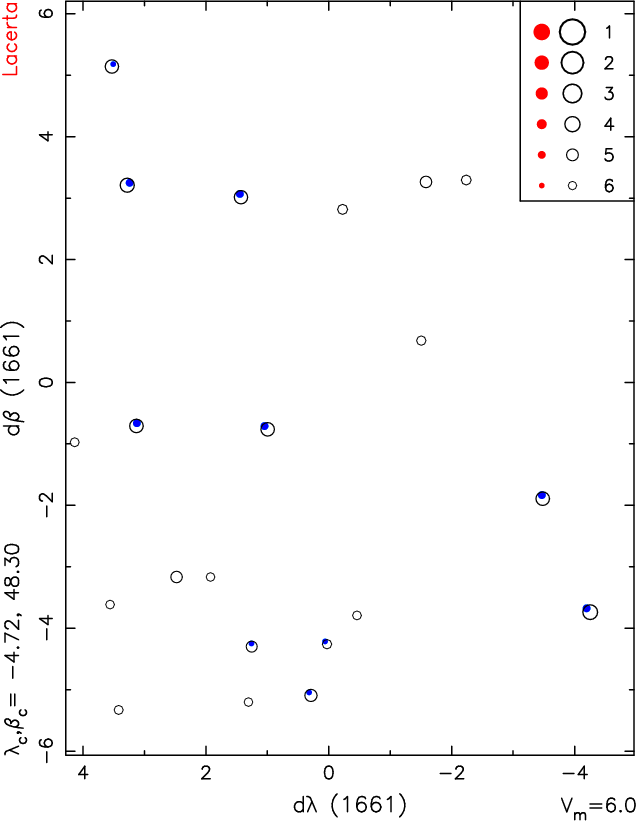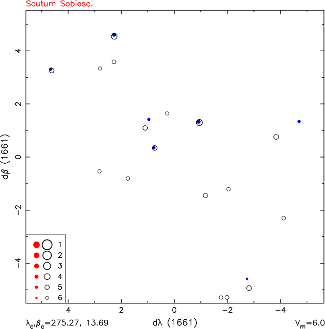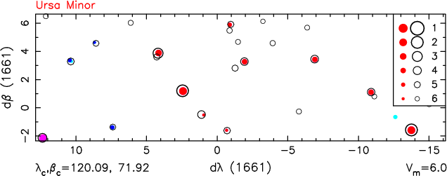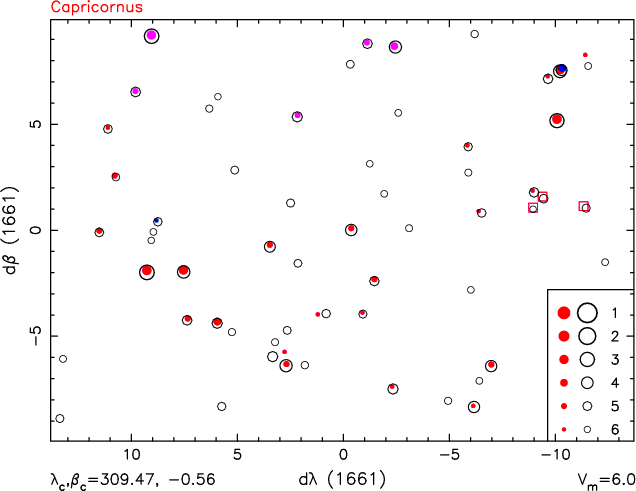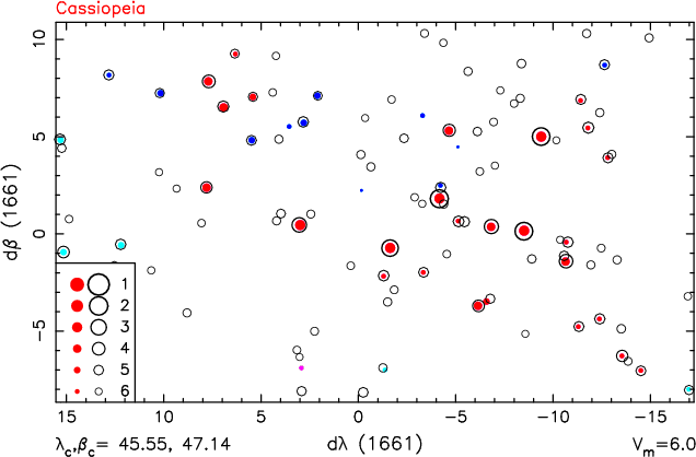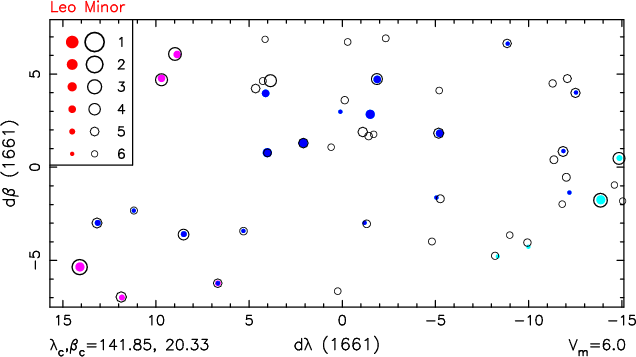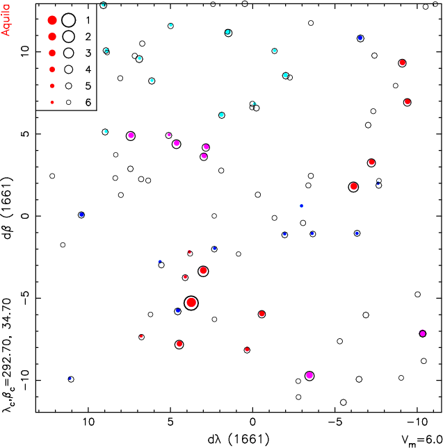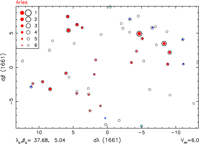To illustrate and clarify our identifications we provide a Figure for each constellation. In these figures the stars listed with the constellation in Hevelius are shown red when Hevelius gives them an OT value (>0) indicating their presence in Kepler or in Secunda classis, and blue otherwise (OT = 0).Other stars listed in