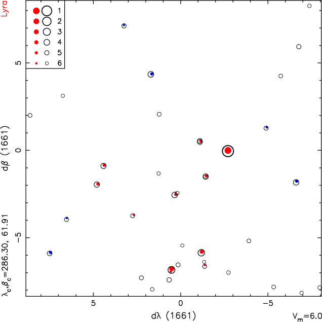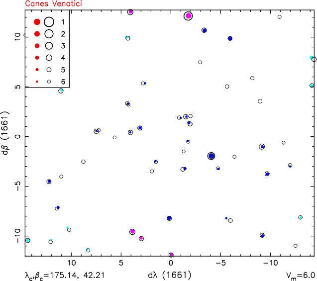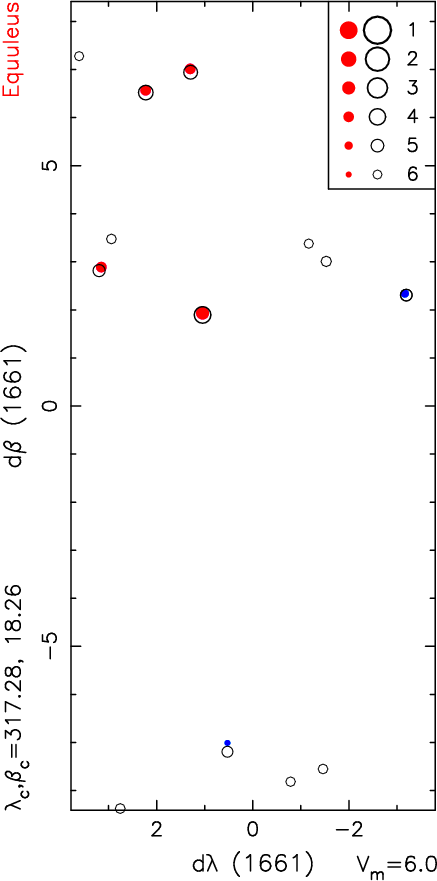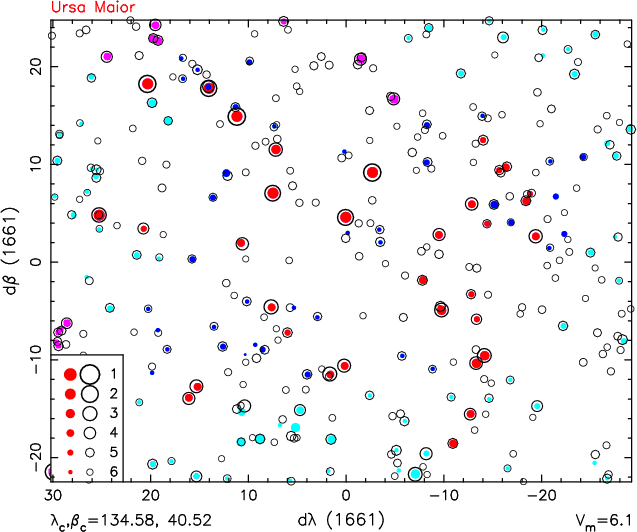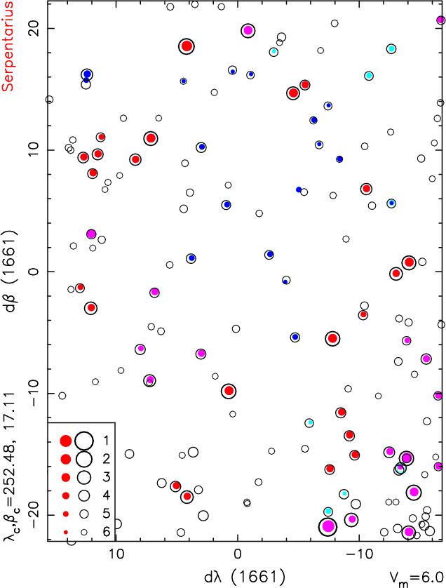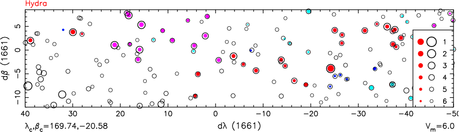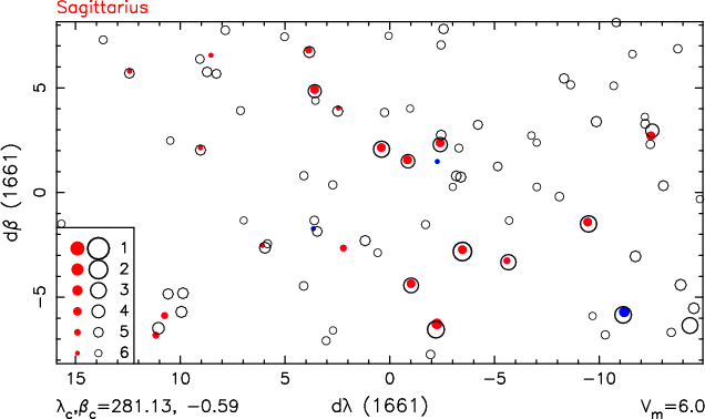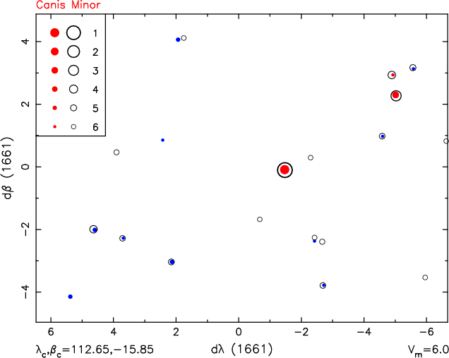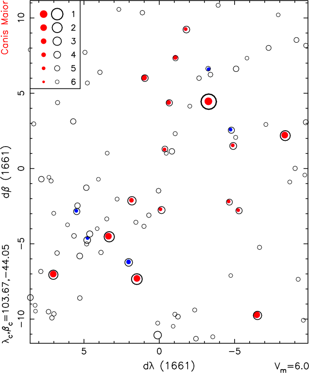 To illustrate and clarify our identifications we provide a Figure for each constellation. In these figures the stars listed with the constellation in Hevelius are shown red when Hevelius gives them an OT value (>0) indicating their presence in Kepler or in Secunda classis, and blue otherwise (OT = 0).Other stars listed in