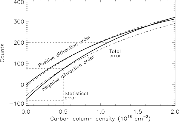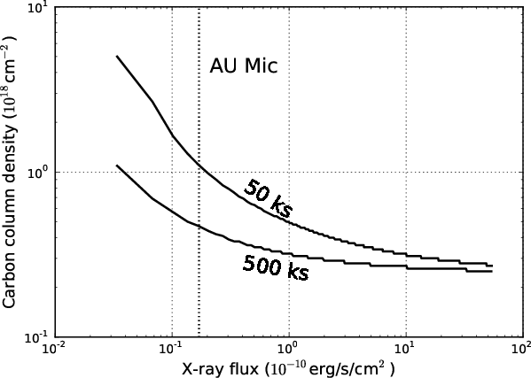 Figure B.1: The detectable carbon column density by measuring the jump height at the carbon edge as a function of the X-ray flux (0.1 keV-2.0 keV). Here, a pure carbon disk is assumed. The two lines represent a 50 ks and a 500 ks exposure with the LETGS. The same temperature structure as AU Mic is assumed which determines the higher order contribution around the carbon edge. The vertical dotted line indicates the X-ray flux of AU Mic. |