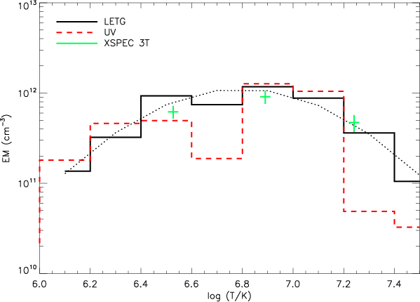 The large wavelength coverage of the LETGS offers the ability to quantify the emission measure distribution (EMD) in the corona. Using the lines listed in Table C.1, we reconstructed the EMD using the PintOfAle (Kashyap & Drake 2000) package. Our result compares well with the result obtained using the line fluxes measured in the UV wavelength range by Del Zanna et al. (2002). We also experimented with the Chianti package (Dere et al. 1997; Landi et al. 2006) and found that the results are strongly influenced by numerical problems due to the shallow temperature coverage of the observed lines. However, both methods give rather similar results.