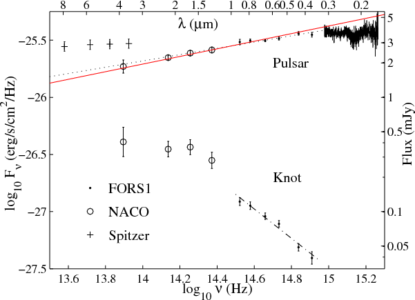 Incoherent synchrotron radiation was recognized early on as a likely emission mechanism for the infrared-optical pulses in the Crab pulsar (e.g., Shklovsky 1970; Pacini 1971). However, as discussed by O'Dell & Sartori (1970) and Epstein & Petrosian (1973), some of the model constraints imposed by the pulsed nature of the emission were initially not explicitly included; e.g., the assumption that the pulses are due to a combination of rotation and relativistic streaming/small pitch angles implies that the frequency of the observed emission should be at least as high as the Doppler boosted cyclotron frequency. This puts an upper limit on the magnetic field in the emission region. With a dipolar magnetic field structure, this results in a minimum distance to the emission region corresponding roughly to the light cylinder radius or even somewhat larger (e.g., Golden et al. 2000).The spectral characteristics in the infrared-optical range
