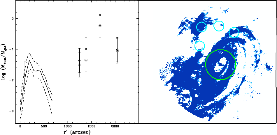 Figure 7: In the left panel the DGR calculated for Arp's loop and the M 81 disk are shown as a function of the equivalent angular distance from the galactic center. Neutral hydrogen masses were calculated using both the Walter et al. (2008; black points) and Yun et al. (1994; grey points) HI maps. The radial DGR profile measured by Muñoz-Mateos et al. (2009) is overplotted. In the right panel the THINGS image of M 81 is shown. The circular apertures are also shown with the same color code as in Fig. 3. |