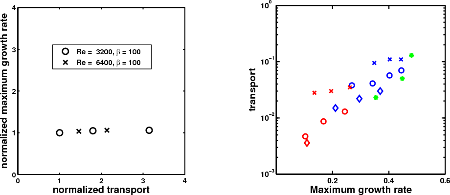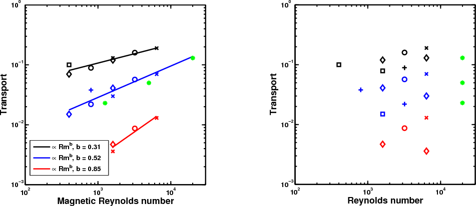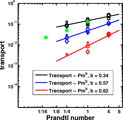 the transport has a power-law dependence on the magnetic Reynolds number rather than on the Prandtl number; for Pm > 1, the data are consistent with a primary dependence on Pm for large enough (